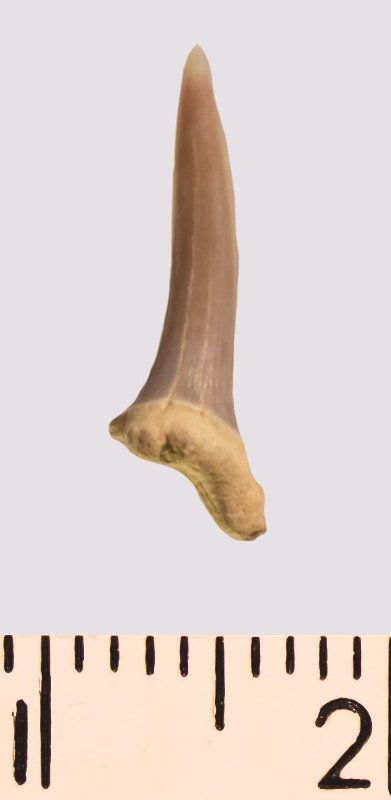 Зуб. Акула. Scapanorhynchus rhaphiodon Agassiz 1843. Классификация: Хордовые Chordata, Позвоночные Vertebrata, Хрящевые рыбы Chondrichthyes, Пластиножаберные Elasmobranchii