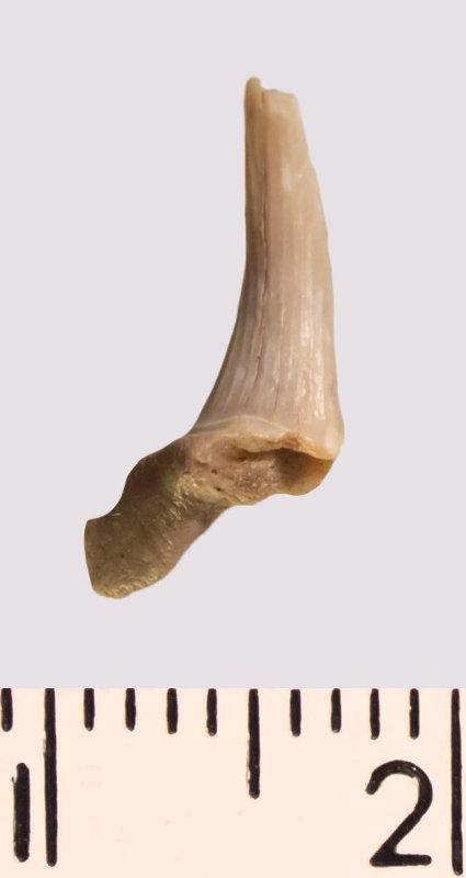 Зуб. Акула. Scapanorhynchus rhaphiodon Agassiz 1843. Классификация: Хордовые Chordata, Позвоночные Vertebrata, Хрящевые рыбы Chondrichthyes, Пластиножаберные Elasmobranchii