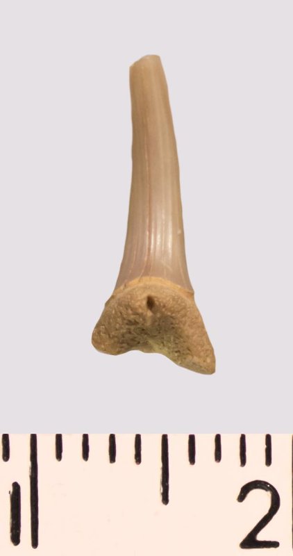 Зуб. Акула. Scapanorhynchus rhaphiodon Agassiz 1843. Классификация: Хордовые Chordata, Позвоночные Vertebrata, Хрящевые рыбы Chondrichthyes, Пластиножаберные Elasmobranchii