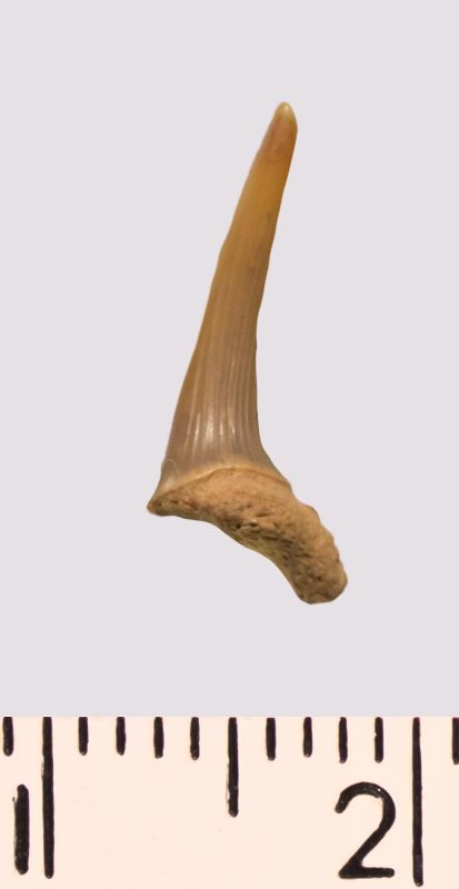 Зуб. Акула. Scapanorhynchus rhaphiodon Agassiz 1843. Классификация: Хордовые Chordata, Позвоночные Vertebrata, Хрящевые рыбы Chondrichthyes, Пластиножаберные Elasmobranchii