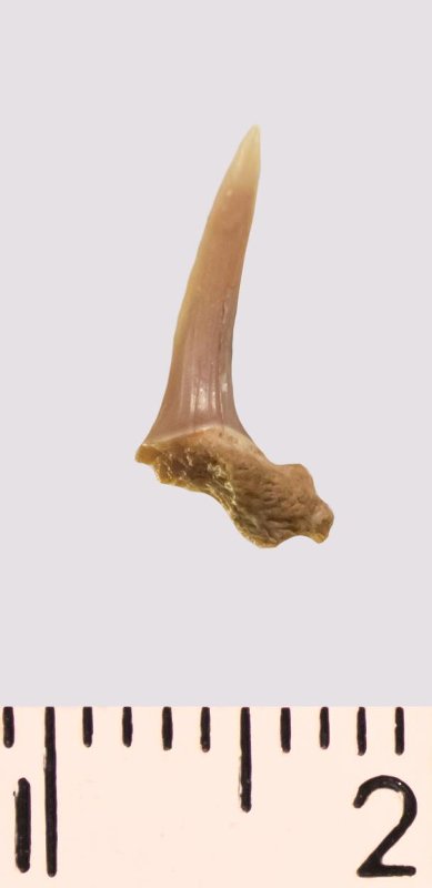 Зуб. Акула. Scapanorhynchus rhaphiodon Agassiz 1843. Классификация: Хордовые Chordata, Позвоночные Vertebrata, Хрящевые рыбы Chondrichthyes, Пластиножаберные Elasmobranchii