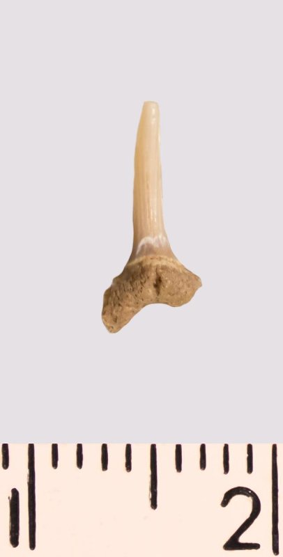 Зуб. Акула. Scapanorhynchus rhaphiodon Agassiz 1843. Классификация: Хордовые Chordata, Позвоночные Vertebrata, Хрящевые рыбы Chondrichthyes, Пластиножаберные Elasmobranchii