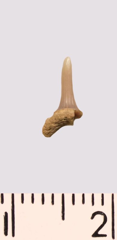 Зуб. Акула. Scapanorhynchus rhaphiodon Agassiz 1843. Классификация: Хордовые Chordata, Позвоночные Vertebrata, Хрящевые рыбы Chondrichthyes, Пластиножаберные Elasmobranchii