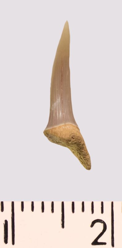 Зуб. Акула. Scapanorhynchus rhaphiodon Agassiz 1843. Классификация: Хордовые Chordata, Позвоночные Vertebrata, Хрящевые рыбы Chondrichthyes, Пластиножаберные Elasmobranchii