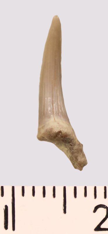 Зуб. Акула. Scapanorhynchus rhaphiodon Agassiz 1843. Классификация: Хордовые Chordata, Позвоночные Vertebrata, Хрящевые рыбы Chondrichthyes, Пластиножаберные Elasmobranchii