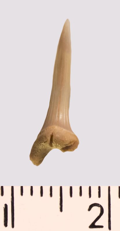 Зуб. Акула. Scapanorhynchus rhaphiodon Agassiz 1843. Классификация: Хордовые Chordata, Позвоночные Vertebrata, Хрящевые рыбы Chondrichthyes, Пластиножаберные Elasmobranchii
