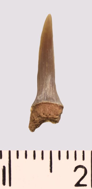 Зуб. Акула. Scapanorhynchus rhaphiodon Agassiz 1843. Классификация: Хордовые Chordata, Позвоночные Vertebrata, Хрящевые рыбы Chondrichthyes, Пластиножаберные Elasmobranchii