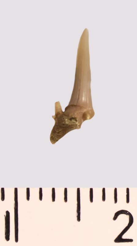 Зуб. Акула. Scapanorhynchus rhaphiodon Agassiz 1843. Классификация: Хордовые Chordata, Позвоночные Vertebrata, Хрящевые рыбы Chondrichthyes, Пластиножаберные Elasmobranchii
