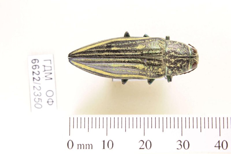 Сухое насекомое. Златка. Pseudotaenia salamandra (Thomson, 1879). Классификация: Членистоногие Arthropoda, Насекомые Insecta, Жуки Coleoptera, Златки Buprestidae