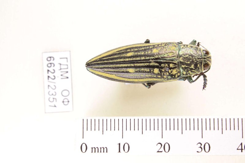 Сухое насекомое. Златка. Pseudotaenia salamandra (Thomson, 1879). Классификация: Членистоногие Arthropoda, Насекомые Insecta, Жуки Coleoptera, Златки Buprestidae