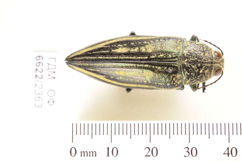 Сухое насекомое. Златка. Pseudotaenia salamandra (Thomson, 1879). Классификация: Членистоногие Arthropoda, Насекомые Insecta, Жуки Coleoptera, Златки Buprestidae