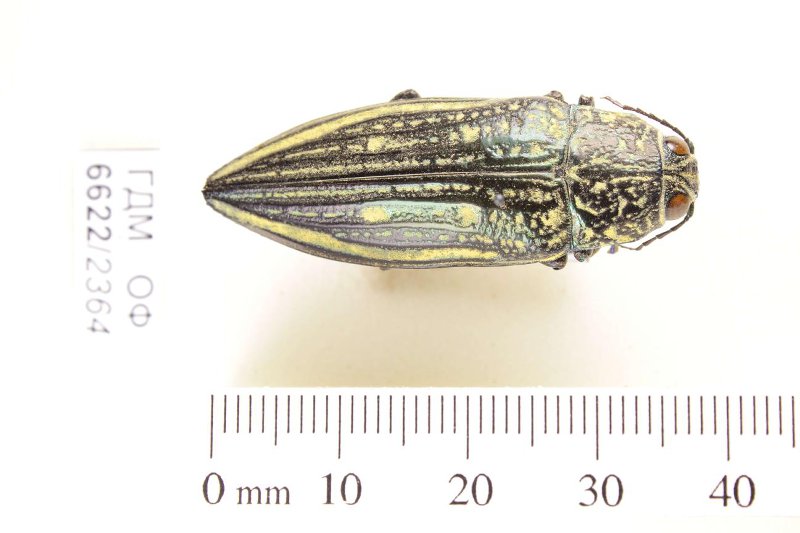 Сухое насекомое. Златка. Pseudotaenia salamandra (Thomson, 1879). Классификация: Членистоногие Arthropoda, Насекомые Insecta, Жуки Coleoptera, Златки Buprestidae