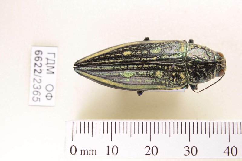 Сухое насекомое. Златка. Pseudotaenia salamandra (Thomson, 1879). Классификация: Членистоногие Arthropoda, Насекомые Insecta, Жуки Coleoptera, Златки Buprestidae