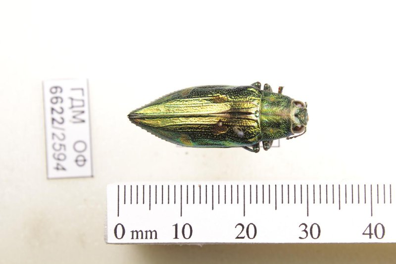 Сухое насекомое. Златка. Chrysodema furcata Kerremans, 1919. Классификация: Членистоногие Arthropoda, Насекомые Insecta, Жуки Coleoptera, Златки Buprestidae