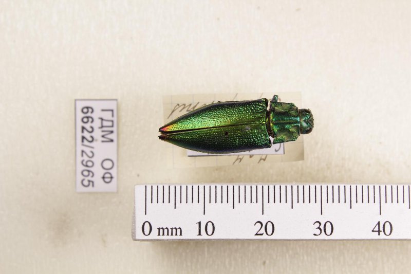 Сухое насекомое. Златка. Cyphogastra gloriosa Gestro, 1877. Классификация: Членистоногие Arthropoda, Насекомые Insecta, Жуки Coleoptera, Златки Buprestidae