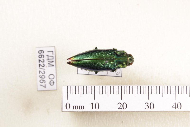 Сухое насекомое. Златка. Cyphogastra gloriosa Gestro, 1877. Классификация: Членистоногие Arthropoda, Насекомые Insecta, Жуки Coleoptera, Златки Buprestidae