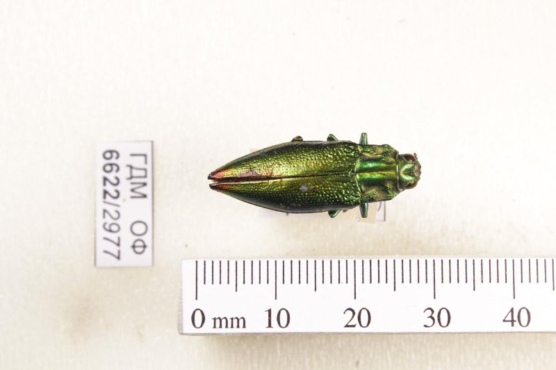 Сухое насекомое. Златка. Cyphogastra gloriosa Gestro, 1877. Классификация: Членистоногие Arthropoda, Насекомые Insecta, Жуки Coleoptera, Златки Buprestidae