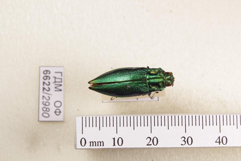 Сухое насекомое. Златка. Cyphogastra gloriosa Gestro, 1877. Классификация: Членистоногие Arthropoda, Насекомые Insecta, Жуки Coleoptera, Златки Buprestidae