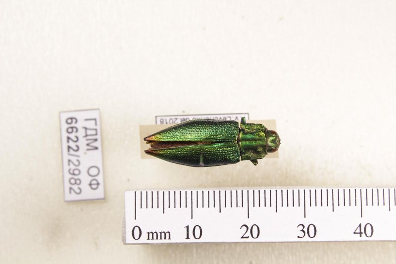 Сухое насекомое. Златка. Cyphogastra gloriosa Gestro, 1877. Классификация: Членистоногие Arthropoda, Насекомые Insecta, Жуки Coleoptera, Златки Buprestidae