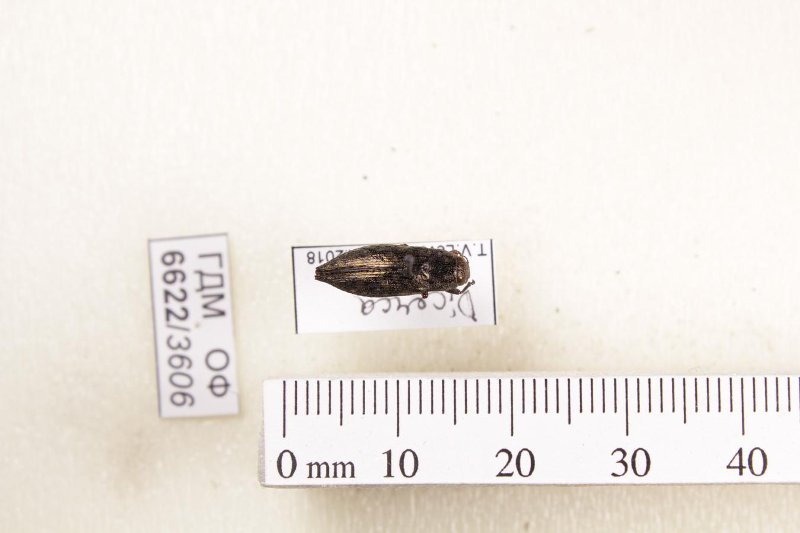 Сухое насекомое. Златка. Dicerca obscura (Fabricius, 1781). Классификация: Членистоногие Arthropoda, Насекомые Insecta, Жуки Coleoptera, Златки Buprestidae