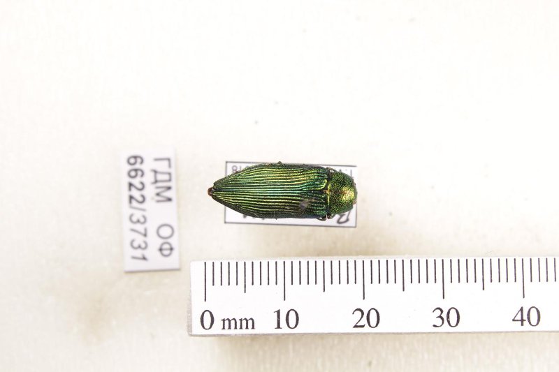 Сухое насекомое. Златка. Buprestis apricans Herbst, 1801. Классификация: Членистоногие Arthropoda, Насекомые Insecta, Жуки Coleoptera, Златки Buprestidae