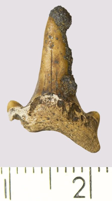 Зуб. Акула. Lamniformes gen. et sp. indet. Классификация: Хордовые Chordata, Позвоночные Vertebrata, Хрящевые рыбы Chondrichthyes, Пластиножаберные Elasmobranchii