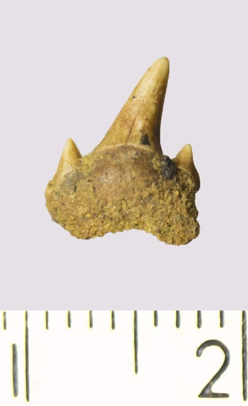Зуб. Акула. Lamniformes gen. et sp. indet. Классификация: Хордовые Chordata, Позвоночные Vertebrata, Хрящевые рыбы Chondrichthyes, Пластиножаберные Elasmobranchii