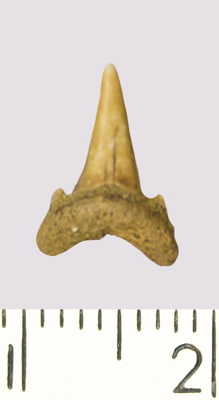 Зуб. Акула. Odontaspis venusta (Leriche, 1929). Классификация: Хордовые Chordata, Позвоночные Vertebrata, Хрящевые рыбы Chondrichthyes, Пластиножаберные Elasmobranchii