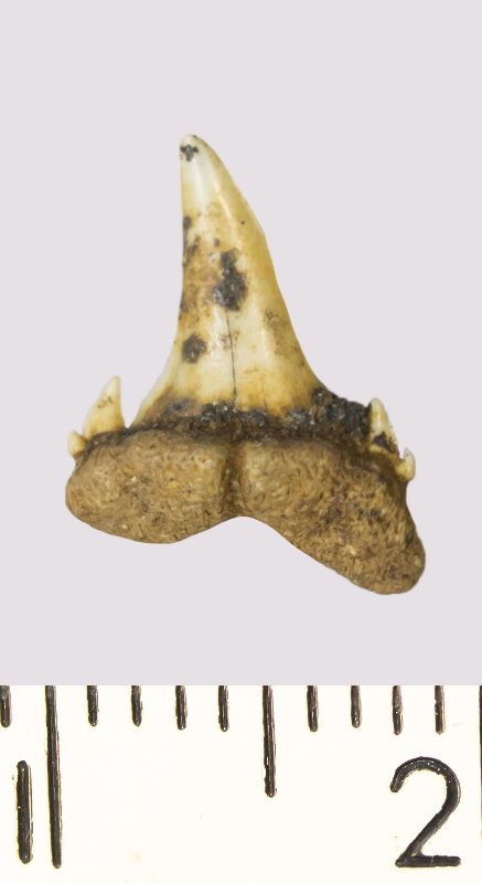 Зуб. Акула. Odontaspis venusta (Leriche, 1929). Классификация: Хордовые Chordata, Позвоночные Vertebrata, Хрящевые рыбы Chondrichthyes, Пластиножаберные Elasmobranchii