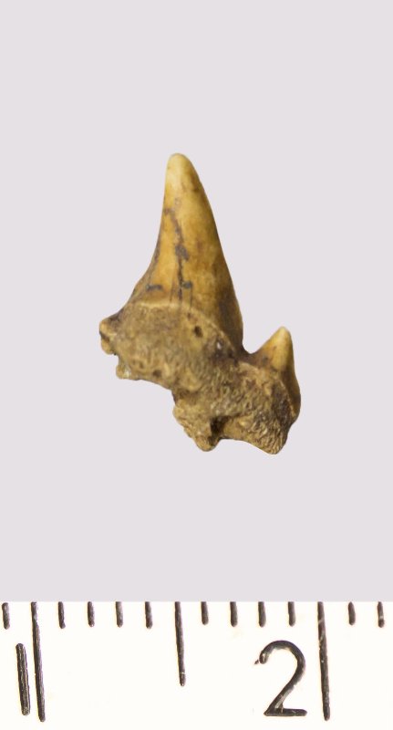 Зуб. Акула. Odontaspis macrorhiza (Cope) Leriche, 1902. Классификация: Хордовые Chordata, Позвоночные Vertebrata, Хрящевые рыбы Chondrichthyes, Пластиножаберные Elasmobranchii