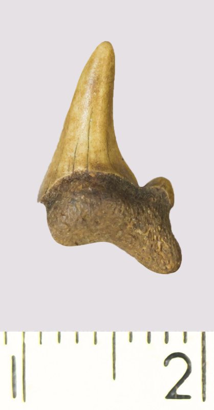 Зуб. Акула. Odontaspis macrorhiza (Cope) Leriche, 1902. Классификация: Хордовые Chordata, Позвоночные Vertebrata, Хрящевые рыбы Chondrichthyes, Пластиножаберные Elasmobranchii