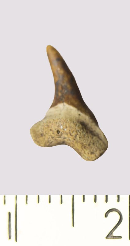 Зуб. Акула. Odontaspis macrorhiza (Cope) Leriche, 1902. Классификация: Хордовые Chordata, Позвоночные Vertebrata, Хрящевые рыбы Chondrichthyes, Пластиножаберные Elasmobranchii