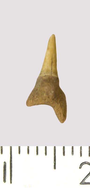 Зуб. Акула. Odontaspis macrorhiza (Cope) Leriche, 1902. Классификация: Хордовые Chordata, Позвоночные Vertebrata, Хрящевые рыбы Chondrichthyes, Пластиножаберные Elasmobranchii