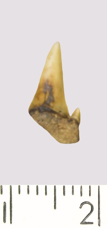 Зуб. Акула. Odontaspis macrorhiza (Cope) Leriche, 1902. Классификация: Хордовые Chordata, Позвоночные Vertebrata, Хрящевые рыбы Chondrichthyes, Пластиножаберные Elasmobranchii