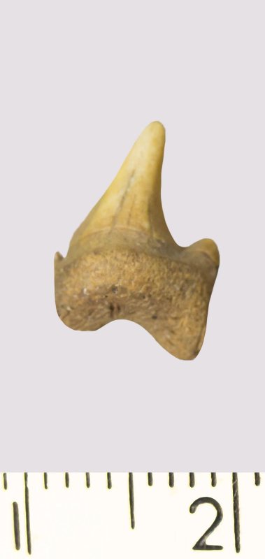 Зуб. Акула. Odontaspis macrorhiza (Cope) Leriche, 1902. Классификация: Хордовые Chordata, Позвоночные Vertebrata, Хрящевые рыбы Chondrichthyes, Пластиножаберные Elasmobranchii