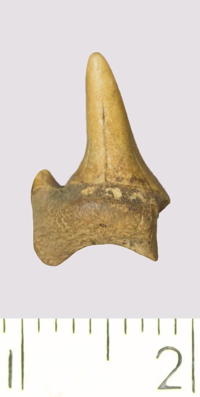 Зуб. Акула. Odontaspis macrorhiza (Cope) Leriche, 1902. Классификация: Хордовые Chordata, Позвоночные Vertebrata, Хрящевые рыбы Chondrichthyes, Пластиножаберные Elasmobranchii
