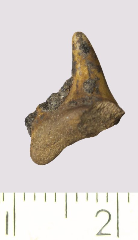 Зуб. Акула. Odontaspis macrorhiza (Cope) Leriche, 1902. Классификация: Хордовые Chordata, Позвоночные Vertebrata, Хрящевые рыбы Chondrichthyes, Пластиножаберные Elasmobranchii
