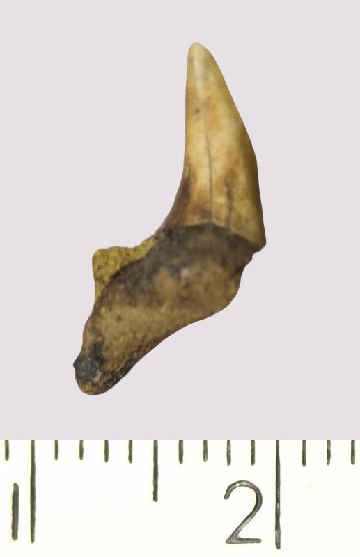 Зуб. Акула. Odontaspis macrorhiza (Cope) Leriche, 1902. Классификация: Хордовые Chordata, Позвоночные Vertebrata, Хрящевые рыбы Chondrichthyes, Пластиножаберные Elasmobranchii