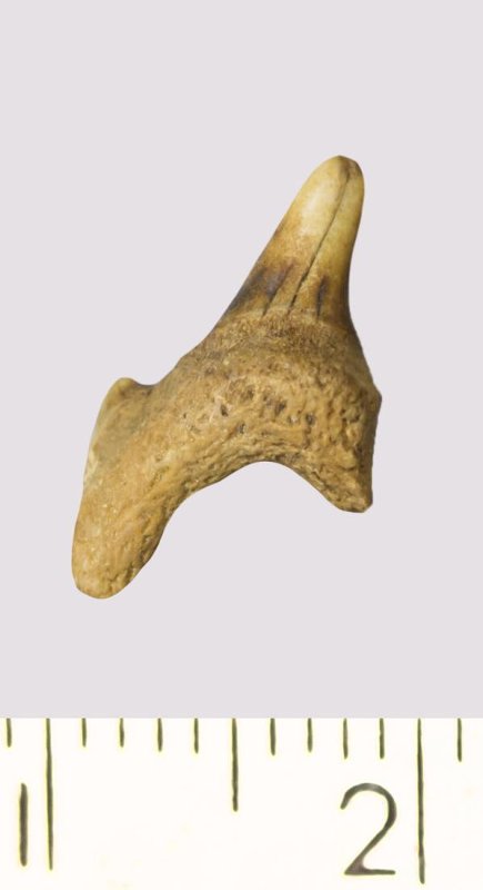 Зуб. Акула. Odontaspis macrorhiza (Cope) Leriche, 1902. Классификация: Хордовые Chordata, Позвоночные Vertebrata, Хрящевые рыбы Chondrichthyes, Пластиножаберные Elasmobranchii
