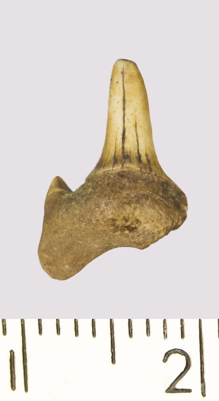 Зуб. Акула. Odontaspis macrorhiza (Cope) Leriche, 1902. Классификация: Хордовые Chordata, Позвоночные Vertebrata, Хрящевые рыбы Chondrichthyes, Пластиножаберные Elasmobranchii