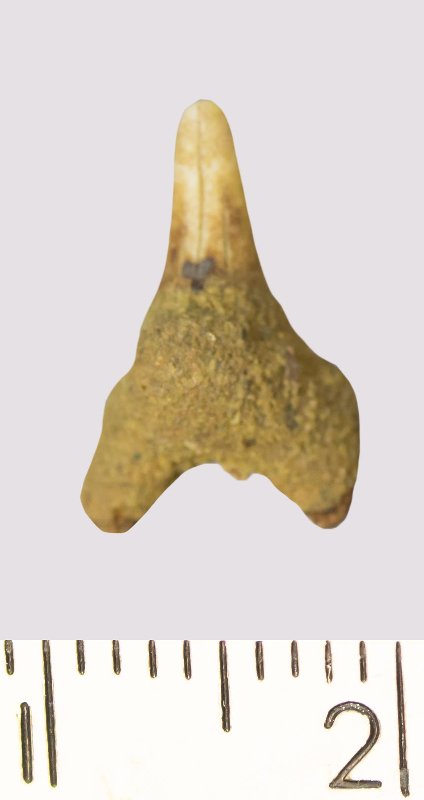 Зуб. Акула. Odontaspis macrorhiza (Cope) Leriche, 1902. Классификация: Хордовые Chordata, Позвоночные Vertebrata, Хрящевые рыбы Chondrichthyes, Пластиножаберные Elasmobranchii