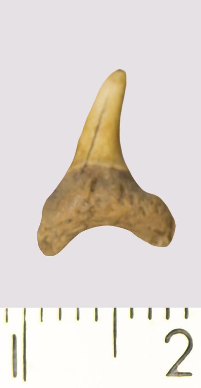 Зуб. Акула. Odontaspis macrorhiza (Cope) Leriche, 1902. Классификация: Хордовые Chordata, Позвоночные Vertebrata, Хрящевые рыбы Chondrichthyes, Пластиножаберные Elasmobranchii