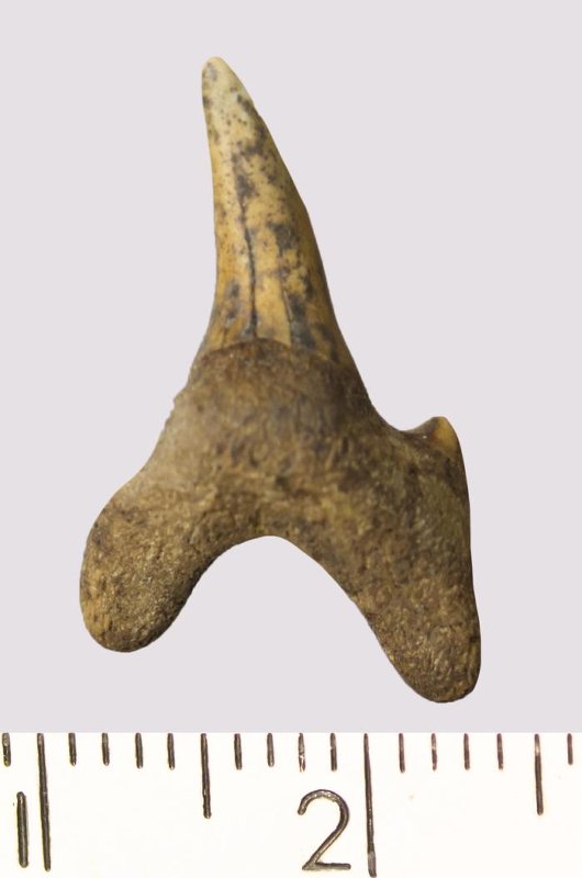 Зуб. Акула. Odontaspis macrorhiza (Cope) Leriche, 1902. Классификация: Хордовые Chordata, Позвоночные Vertebrata, Хрящевые рыбы Chondrichthyes, Пластиножаберные Elasmobranchii