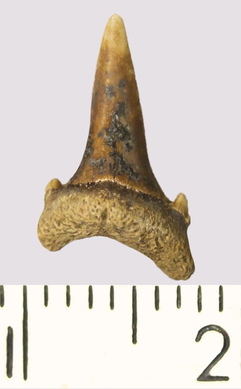 Зуб. Акула. Odontaspis venusta (Leriche, 1929). Классификация: Хордовые Chordata, Позвоночные Vertebrata, Хрящевые рыбы Chondrichthyes, Пластиножаберные Elasmobranchii