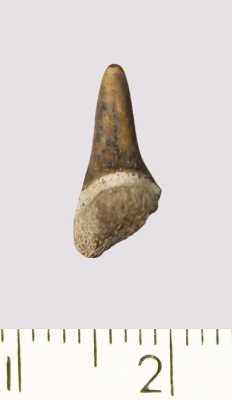 Зуб (фрагмент). Акула. Odontaspis macrorhiza (Cope) Leriche, 1902. Классификация: Хордовые Chordata, Позвоночные Vertebrata, Хрящевые рыбы Chondrichthyes, Пластиножаберные Elasmobranchii