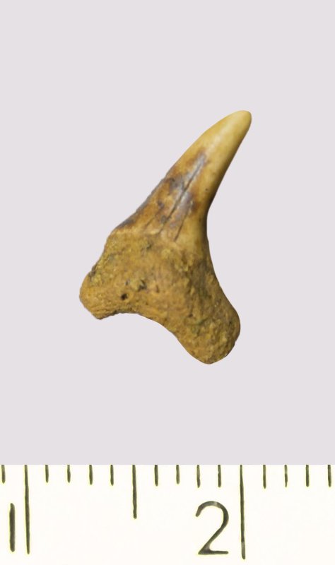 Зуб. Акула. Odontaspis macrorhiza (Cope) Leriche, 1902. Классификация: Хордовые Chordata, Позвоночные Vertebrata, Хрящевые рыбы Chondrichthyes, Пластиножаберные Elasmobranchii