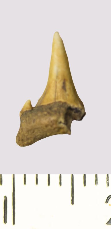 Зуб. Акула. Scapanorhynchus rhaphiodon Agassiz, 1843. Классификация: Хордовые Chordata, Позвоночные Vertebrata, Хрящевые рыбы Chondrichthyes, Пластиножаберные Elasmobranchii