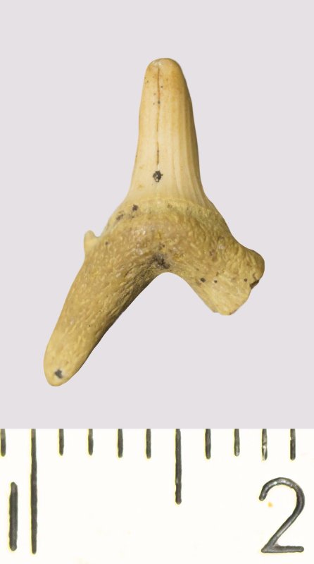 Зуб. Акула. Scapanorhynchus rhaphiodon Agassiz, 1843. Классификация: Хордовые Chordata, Позвоночные Vertebrata, Хрящевые рыбы Chondrichthyes, Пластиножаберные Elasmobranchii