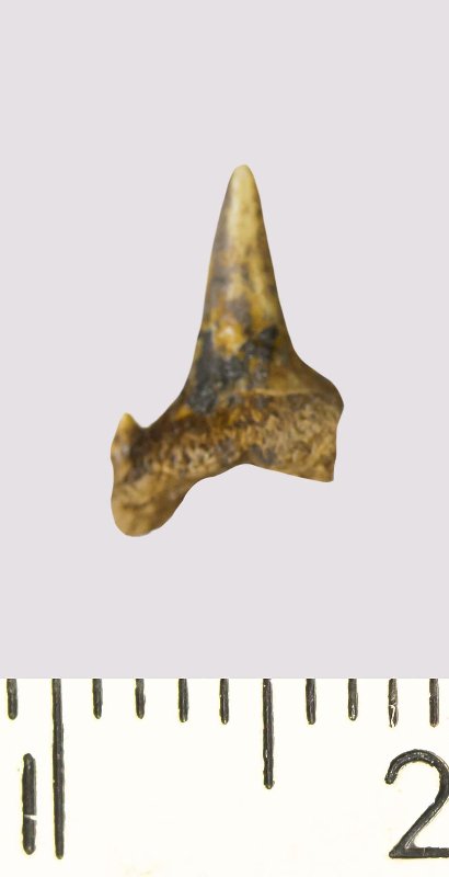 Зуб. Акула. Scapanorhynchus rhaphiodon Agassiz, 1843. Классификация: Хордовые Chordata, Позвоночные Vertebrata, Хрящевые рыбы Chondrichthyes, Пластиножаберные Elasmobranchii