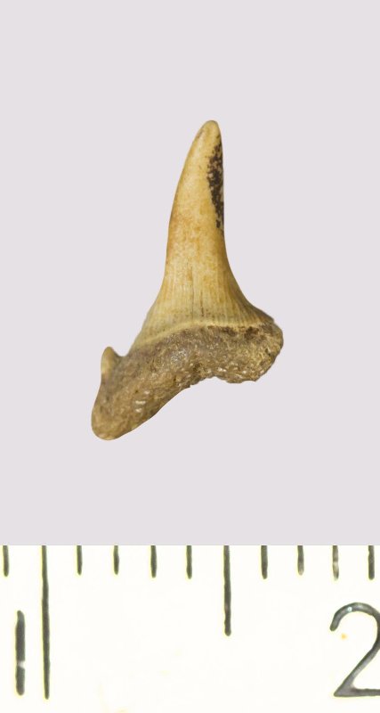 Зуб. Акула. Scapanorhynchus rhaphiodon Agassiz, 1843. Классификация: Хордовые Chordata, Позвоночные Vertebrata, Хрящевые рыбы Chondrichthyes, Пластиножаберные Elasmobranchii